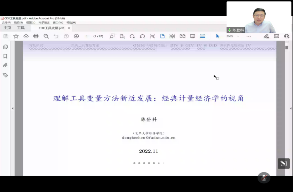 陈登科博士的学术报告主要从经典计量经济学视角来介绍Shift Share Designs, Granular IV以及MTE等新近展的工具变量方法论。他介绍了现代工具变量的基本发展和核心方法,分析针对计量经济学工具变量的使用和实证研究过程中经常遇到的问题。主要内容包括背景知识、经典工具变量方法、GMM与结构式估计、基于经典工具变量方法的新近发展、异质性处理效应模型工具变量方法等五个方面。