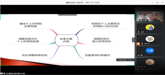 邀请,国家税务总局税务干部进修学院兼职研究员、江苏省省级“稽查能手”、国家税务总局所得税人才库成员吴健高级会计师通过腾讯会议为学院师生作了题为“从首次综合所得汇算清缴看个人所得税制改革与完善”的线上讲座。学院部分教师和19级税务专业硕士研究生等参加了讲座。