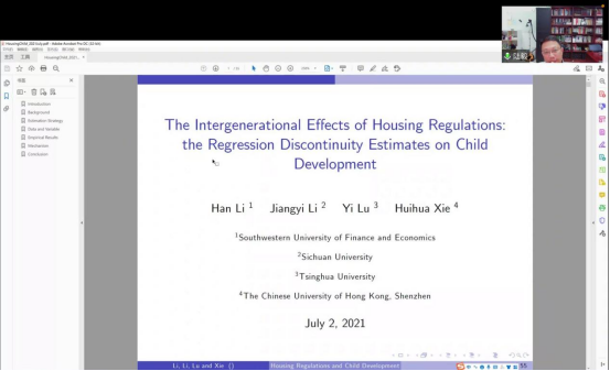 陆毅教授从1949年至2010年中国的住房政策的变化谈起,认为住房政策有效刺激了中国房地产市场的发展,指出多数文章关注房价的影响因素,但鲜有学者论述住房法规对儿童成长的影响。陆毅教授分别从投入时间和金钱的角度,重点讲述了房价政策的变化对父母培养子女的行为影响,并指出:中国政府在2005年前后发布的住房市场调控政策为符合条件的家庭创造意外的财富收益,但是对儿童的影响非常有限。从数量上,房价的上涨没有促进家庭对子女教育时间和金钱的变化;从质量上,房价的上涨对子女教育水平存在一定的消极影响。