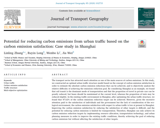 税收学系张琳玲博士以第一作者在SSCI检索国际期刊《Journal of Transport Geography》2020年第85卷发表1篇论文,题为《Potential for reducing carbon emissions from urban traffic based on the carbon emission satisfaction: Case study in Shanghai》,该期刊是在JCR分区中处于经济学领域一区(SSCI, Q1)。本论文构建了碳减排视角下城市交通结构优化模型,该模型不仅从绝对量上分析可以实现的碳减排量,还从相对量上客观分析城市交通碳减排目标实现的难易程度。研究结果显示,现阶段城市交通碳减排满意度极低,此时通过降低其他目标满意度来改善碳减排满意度的难度较大,交通碳减排潜力有限。