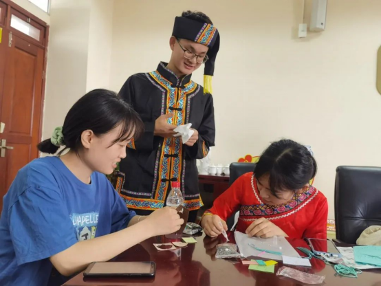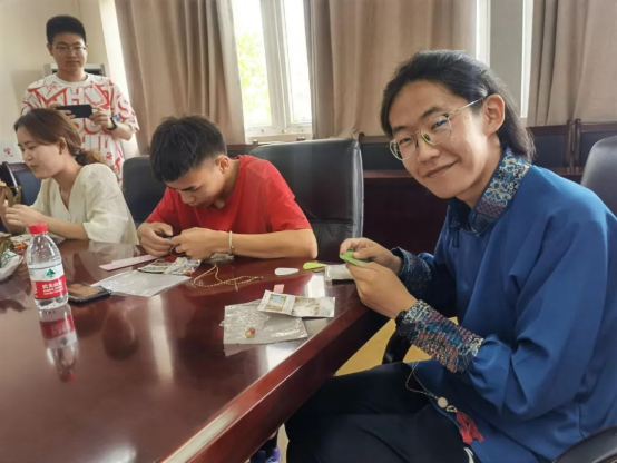 端午做香囊,共谱民族情。“囊中寄语度佳节”环节,老师们为少数民族学生发放香囊材料,师生们认真的穿针引线,制作香囊,小巧精致的香囊在心灵手巧的师生手里一一呈现,现场相互协作,气氛愉悦,师生们在轻松愉悦的环境中完成香囊的制作。这些香囊不仅外表美观,内部也很有“料”。每个香囊里都放着党史知识小卡片,参与者可以通过这些卡片上的内容学习党的百年历程中的重要历史事件,通过这种形式学党史、悟思想,感受红色精神。