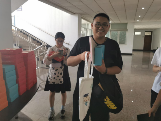 在报到现场,新生何羿锋抽到了学院精心准备的便签本和印有“财税青年,当以身作则,成中流之砥柱”的书签,他说:“生活就像一盒巧克力,我们永远不知道将得到什么。而这份新颖的盲盒让我感到了惊喜!书签上的这句寄语让我对这个专业有了新的认识。”值得一提的是,盲盒中的信件是使用可再生纸张进行书写,部分迎新用的道具也是来源于过去几年的库存,循环利用,在给新生们传递温暖的同时,响应节约资源,保护环境的号召。