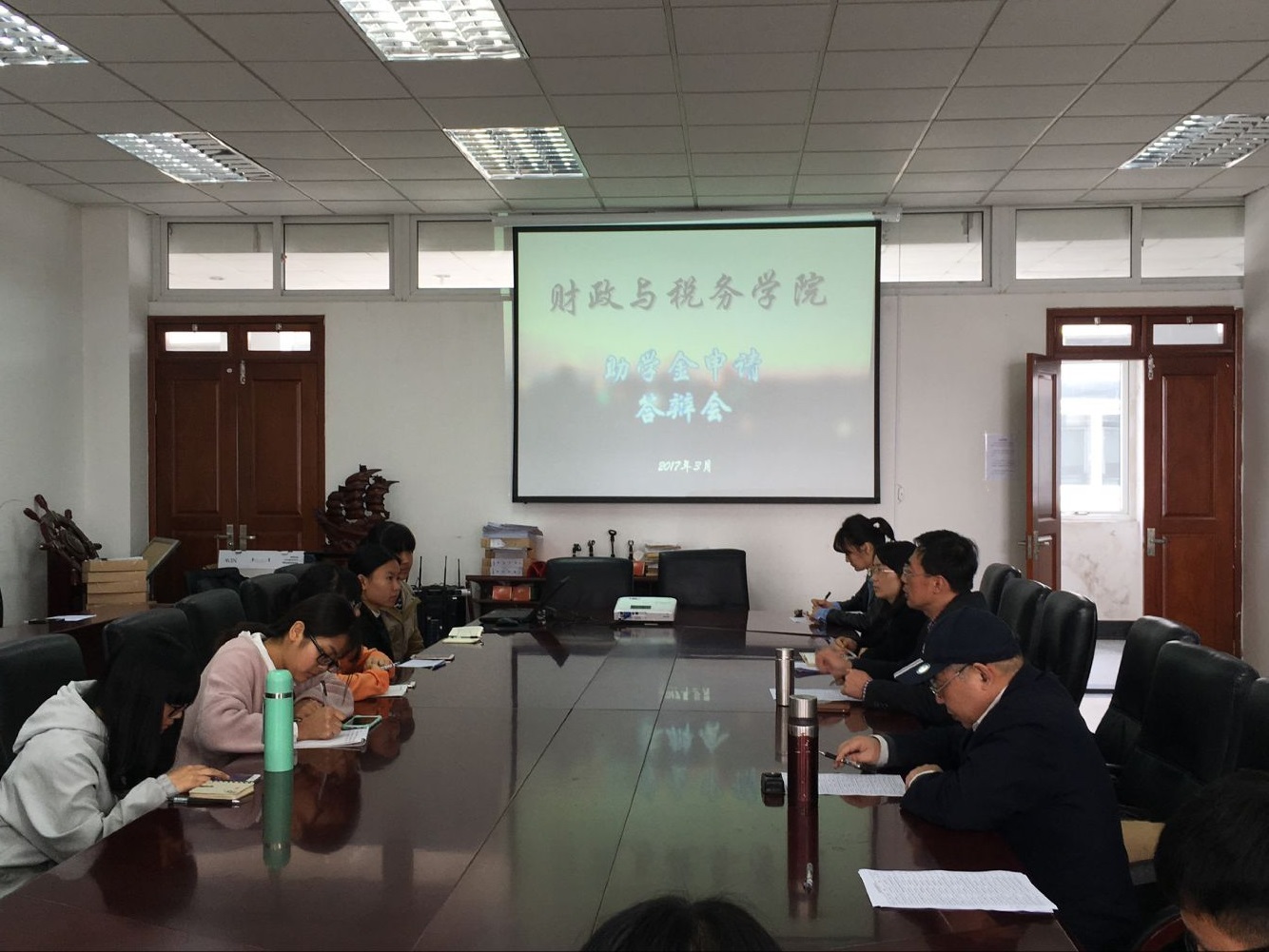 在经济学科楼408会议室举办京州联信、卓成规划、文武人生等学院奖、助学金答辩会。23名申请各类助学金的2016级同学进行了申请答辩。学院党委书记张金龙、党委副书记陈苏、院校友办主任陆新葵、学工办主任全真真及全体辅导员老师参加,答辩会由2016级辅导员李玲老师主持。