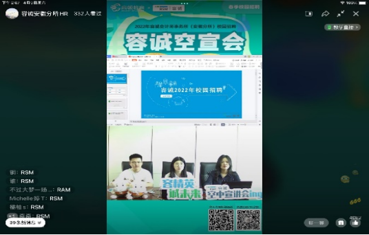 活动主要分为线上参访和线上答疑两个环节。线上参访环节中,容诚会计师事务所的工作人员通过直播的方式向同学们全方位地展示了容诚会计师事务所舒适的工作环境,装修精良的前厅、宽敞明亮的会议室、干净整洁的工作台,同学们深深感受到知名企业的亚洲色情和人文关怀。接着,工作人员为他们详细介绍了会计师事务所的业务模块,使得同学们了解会计师事务所的业务构成和岗位工作内容,树立明确的就业目标。最后,工作人员公布了容诚会计师事务所校招时人才选拔的标准和多种多样的职位申请渠道,激励着同学们以会计人才选拔的高要求严格锻炼自己。随后的线上答疑环节,同学们自由在直播评论区进行评论,由事务所的工作人员解答疑问。“能再详细说说实习期的问题吗”、“如何分配部门”、“想问一下之前的‘容耀生’计划”、“请问应用统计有可投岗位吗”……容诚会计师事务所的工作人员对每一个问题都做出了详细的回答,最后还送出了5张面试直通卡,为同学们提供暑假实习的机会。