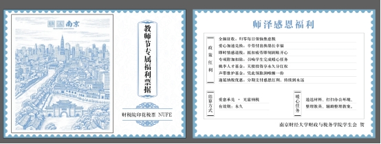 老师们手上拿着的便是南财财税学院学生们精心设计的财税教师节专属福利票据,其设计独具匠心,正面是精致的南京城市线描图,底部“财税院印花税票NUFE”的标识,票据背面的“师泽感恩福利”,满是为老师量身定制的暖心“政策”如:“全额征收:归零每日烦恼焦虑税”,愿老师们抛却烦忧;“爱心加速兑换:辛劳付出换绵长幸福”,感恩老师的辛勤耕耘;“即时情感退税:抵扣疲劳即刻到账开心”,希望老师时刻拥有好心情这份福利票据的结算方式更是暖心,“爱意承兑•无需纳税”,且“有效期:永久”,意味着这份师生情,永远鲜活。收到这份礼物的李老师十分激动,表示财税教师节专属福利票据既融合了财税特色,也很好地给老师们关怀。