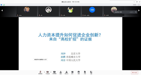 刘冲老师从“创新的主力是企业,而企业创新离不开人力资本”讲起,引出了“人力资本提升如何促进企业创新”这一问题;接着,基于GOOGLE爬虫处理的2000万个专利数据,刘冲老师从1999年起高校扩招这一拟自然实验,利用双重差分法研究发现人力资本提升显著地促进了企业的创新行为,可能的影响渠道包括企业的学习能力增强、学习范围扩大、探索性创新行为增加;最后,通过异质性分析,刘冲老师推导出相关研究结论,即人力资本提升对非国有企业与高校较多地区企业产生的作用更强。