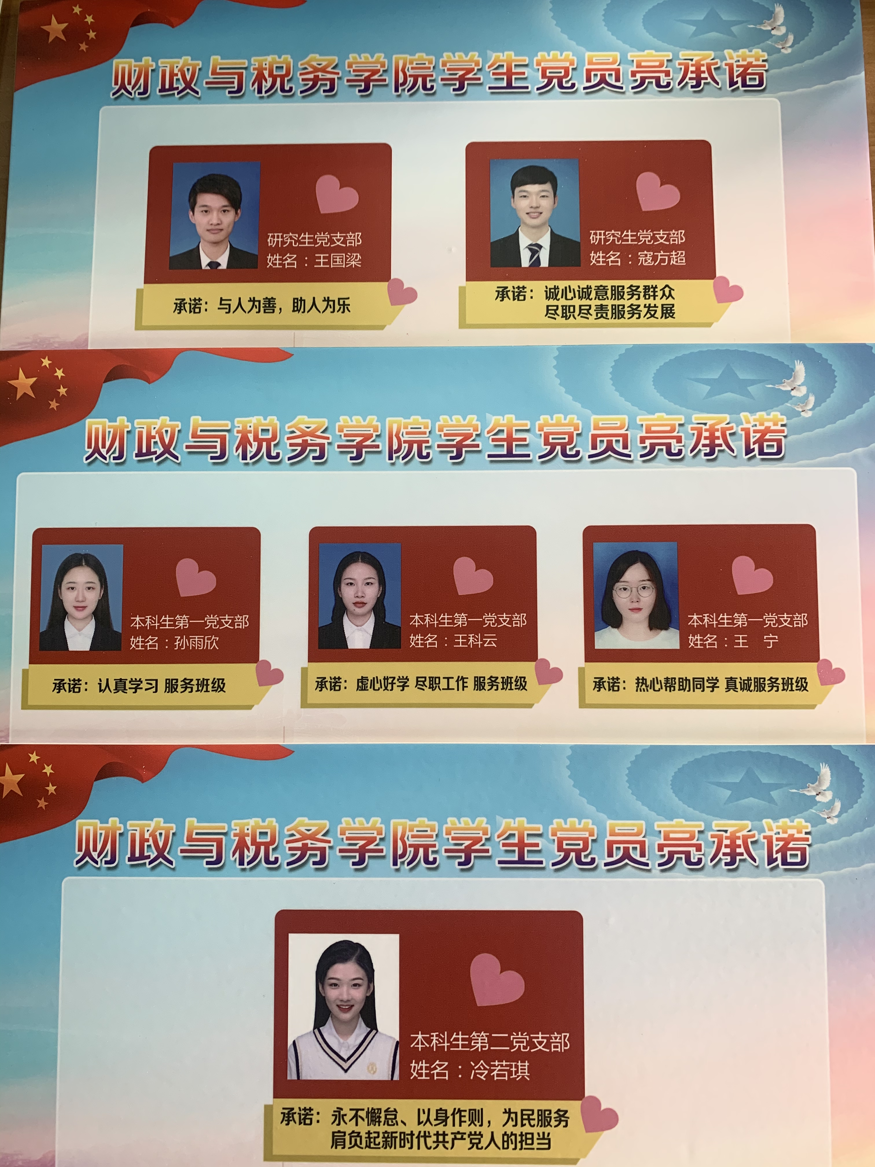 党委开展党员师生“亮身份、晒承诺、比奉献”活动,全体党员教师亮出自己的一句话服务承诺,展示在学院的党务公告栏中;学生党员们的承诺则被晒在寝室里,党员师生的姓名、所属支部、照片以及一句话承诺都被亮在了最显著的区域,自觉接受群众的监督。“落实主体责任,真抓实干,增强师生获得感、幸福感、安全感。”“工作有章程、守规矩,服务有水平、守初心。”“用爱守护初心,用心服务师生”一句句承诺都郑重而温馨。