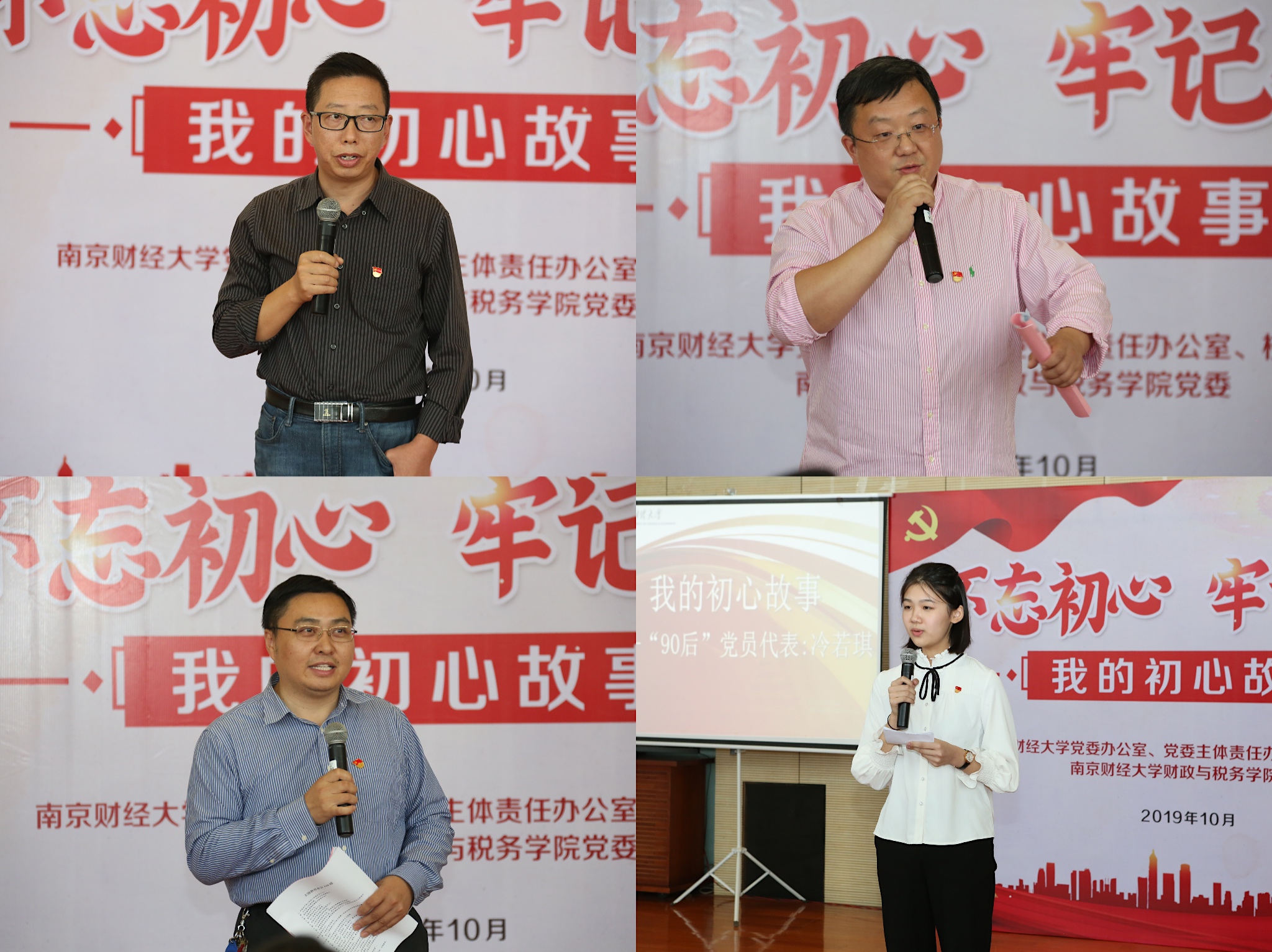 此次分享会分别邀请了“60后”、“70后”、“80后”、“90后”四位党员师生代表讲述自己的初心故事。他们当中有坚守在教书育人一线30年的陶学荣老师,有南财大第一批建设者孙彬主任,有身兼教学科研管理多职的朱军院长,也有平均学分4.4、始终保持专业第一的在校生党员冷若琪。他们成长于不同的时代,奋斗在不同的岗位,却坚守着同一份初心。拥有30年教龄深受学生爱戴的陶学荣老师说:“我的承诺很简单,爱岗敬业,教书育人。这是教师家庭出身的我从小耳濡目染的承诺,也是我坚守了30年的初心。”“90后”党员代表冷若琪同学说到动情之处泪眼婆娑,她说“这是我原本准备好的稿子,但今天现场听到了几位老师的初心与承诺生发出了更多的感慨也特别感动,我们现在生活在如此美好的时代,是他们,是一代又一代的奋斗者为我们创造的,作为大学生我们真的要不惰寸功,用奋斗换取更多人的幸福。”随后财税学院“00后”的入党积极分子们一起朗诵了《理想之歌》,用激情澎湃的声音传达对理想信念的追求。