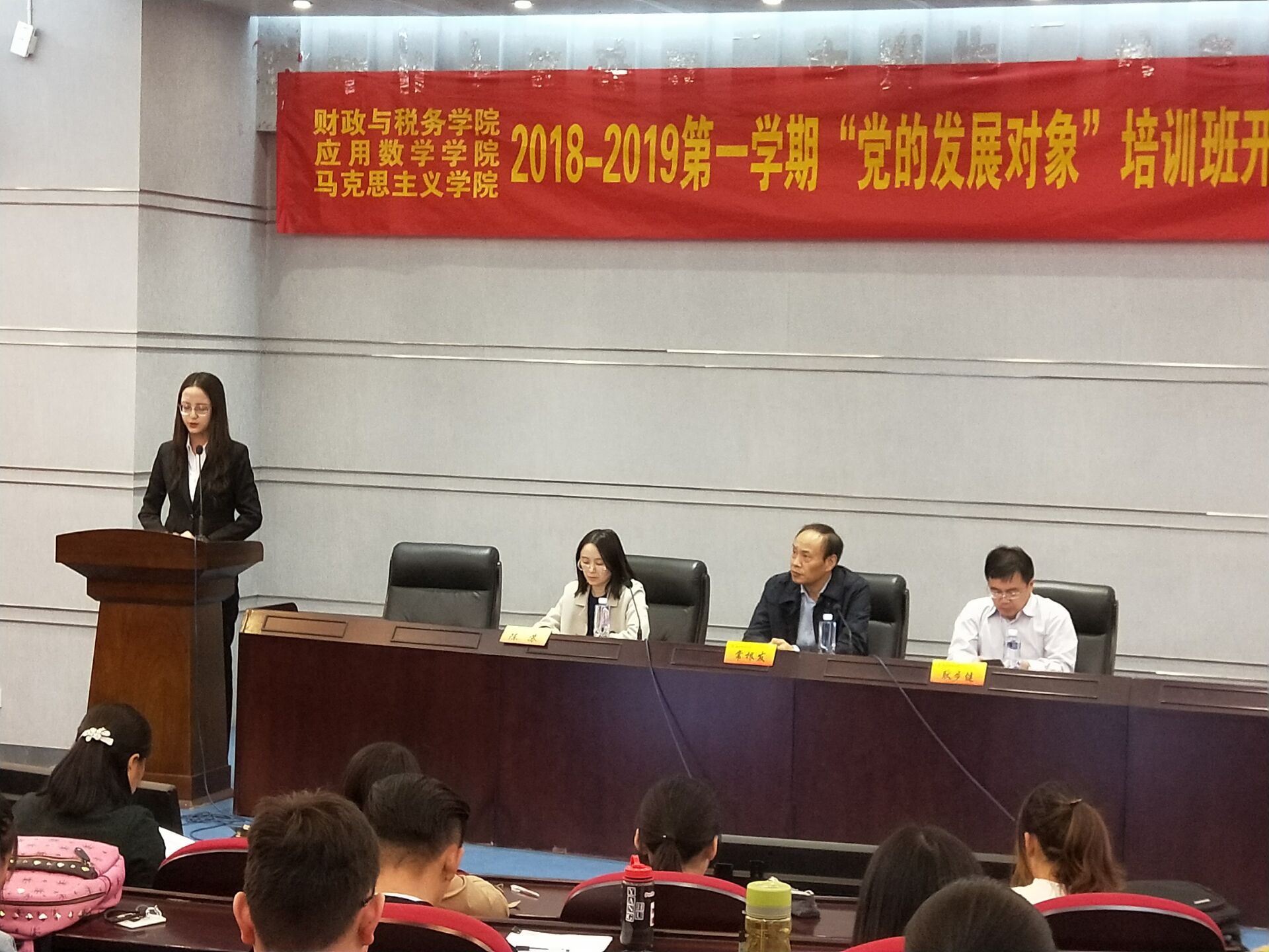 与应用数学学院、马克思主义学院联合开展的第十一期党校在行政楼2楼报告厅举行了开班仪式暨专题报告会。出席本次开班仪式的有财税院党委书记陈苏、应用数学学院党总支书记常根发、马克思主义学院党总支书记耿步健,全体党校学员参加了开班仪式。开班仪式由亚洲色情