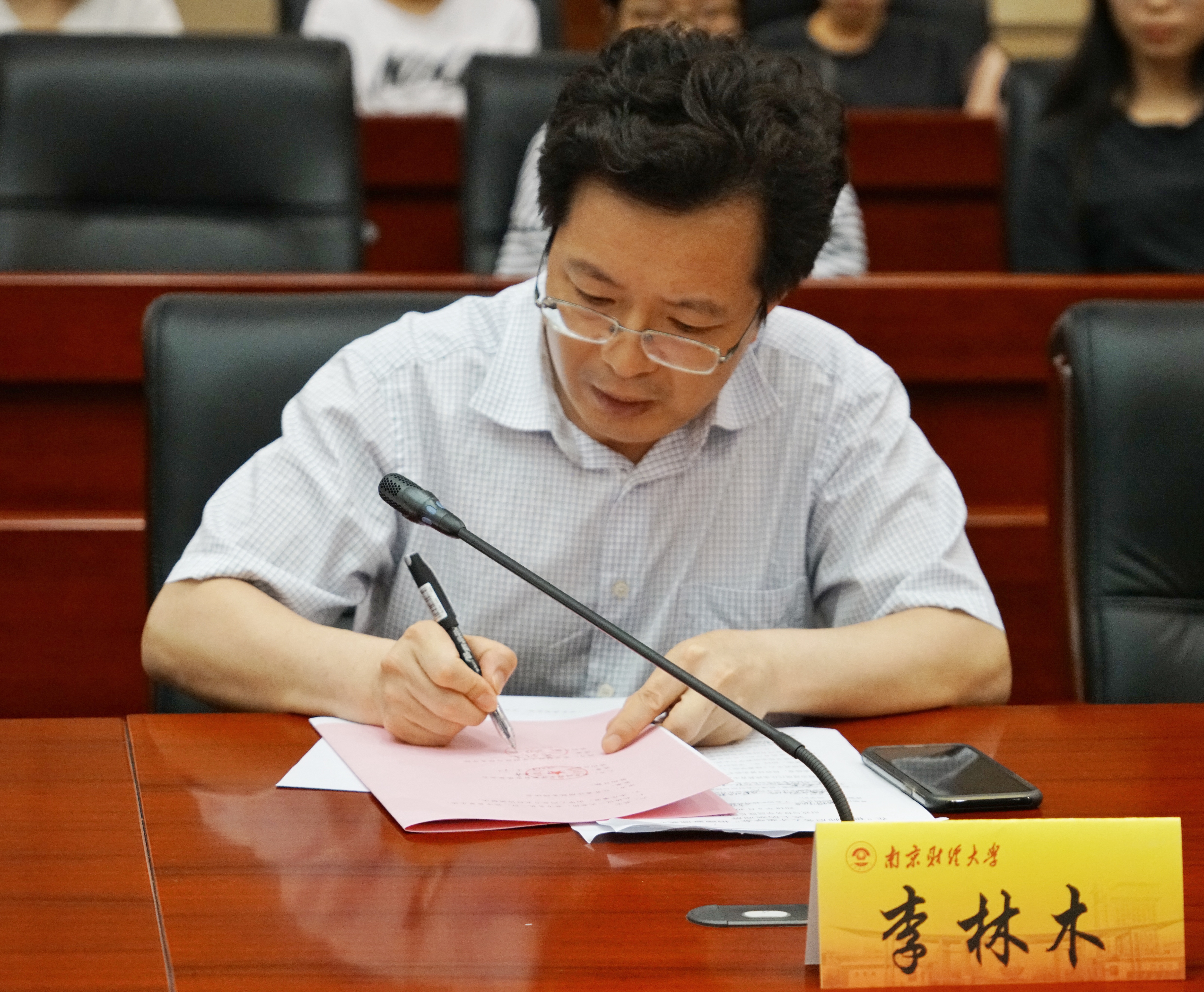 院长李林木分别代表奖学金捐助人、奖学金接受方和使用方在捐赠协议上签字。随后,党委书记陈苏宣读受表彰学生名单,并希望同学们能够珍惜机会、再接再厉。与会嘉宾为在2017年度税务师职业资格考试中取得优异成绩的学生颁发了“税务师后备人才奖学金”。获奖学生代表,一次性通过四门考试的税收1402班葛霜同学发言,她分享了自己的学习和备考经验。