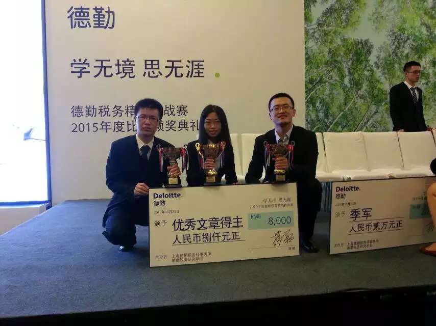 伍洲同学与来自上海财经大学的田志伟同学、来自北京大学的耿纯、赵仲匡同学在众多参赛者中共同名列征文比赛榜首(排名不分先后),喜获德勤税务精英挑战赛论文比赛最高奖项“优秀奖”。