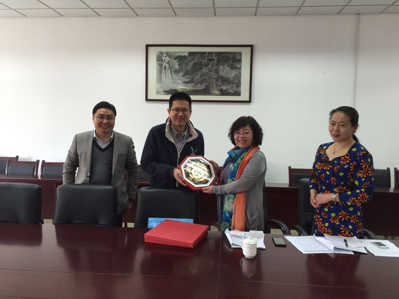 此次交流结束后,黄斌副院长代表学院与来宾交换了学院宣传册和院徽纪念品,并合影留念。