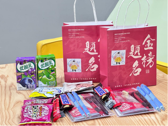 的元素、特色,也有为契合本次活动主题特意定制的标语。“笔”是考试中不可或缺的一份子,一根根精美的以紫色为表的签字笔,是希望考研学子在考试期间能够“下笔如有神”,“紫”定能行;放青松花束更是礼物包里的“重头戏”,将“青松”放入花束,更是希望考研学子能够放轻松,相信他们凭借一路以来的努力可以换来明日的成功,士力架、咖啡、美食这些常见的“助力剂”,令考研学子可以以最饱满的精神状态去迎接考试,大鹏一日同风起,扶摇直上九万里!