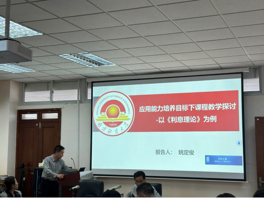 邀请,江苏省教学名师姚定俊教授以说课的形式为学院教师作了题为“应用能力培养目标下课程教学探讨—以《利息理论》为例”讲座,姚定俊教授是江苏省教学名师和江苏省“333工程”中青年学术带头人,金融学院副院长。姚教授以自己讲授的《利息理论》课程为例,从如何做好每学期课程的开场白、如何结合生活中的实际案例帮助学生理解课堂知识、如何利用形式多样的课堂互动调动学生的听课积极性、以及如何结合现实背景和课程具体知识点开展课程思政。期间,姚教授还向大家分享了自己在平时成绩评定、点名以及作业安排等方面的一些小技巧,整个讲座内容非常丰富,氛围也十分轻松。