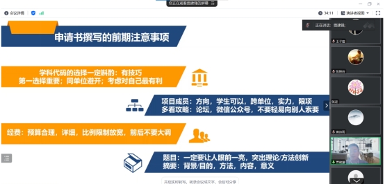 此次的分享会中贾建峰老师以自己的亲身经历为例生动介绍了项目申报时的注意事项,大到课题方向的选择小到学科代码的选择都进行了详细的介绍,特别强调科研项目申请时要端正心态面对困难,不畏困难。