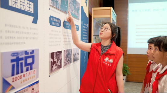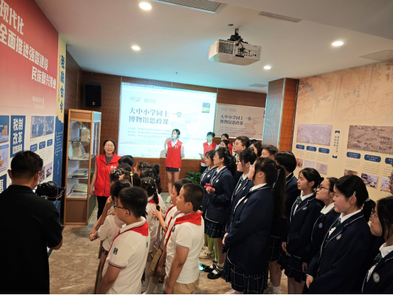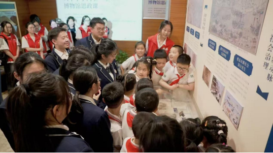 “红途税月”志愿讲解队带领中小学生们体验了最新推出的“运河税韵”触摸展品互动区和历史场景还原影视区。随后,来自南京市的小学、中学、大学的三位教师代表带着学生们,把“教室”搬进了南京税收博物馆《运河税韵里的千年变迁》专题展厅。