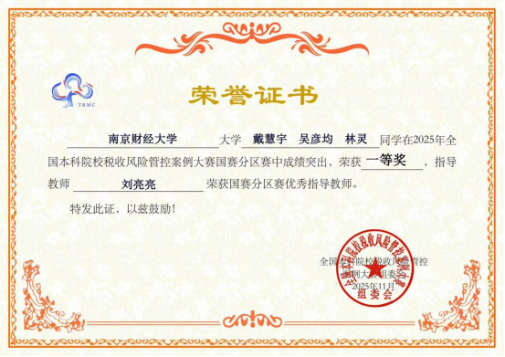 学子风采。 另一支由财政2302戴慧宇、财政2302吴彦均、税收2403林灵组成、由我院刘亮亮老师指导的队伍荣获省赛一等奖。